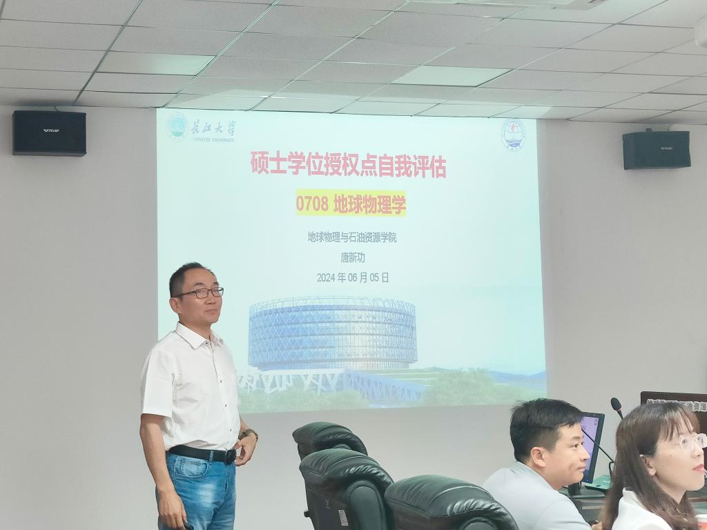 袁海山副院长介绍了地球物理学学位点的发展历程、学科建设等情况。唐新功教授汇报了近五年来地球物理学位授权点建设、人才培养方案以及学科发展等总体情况。
