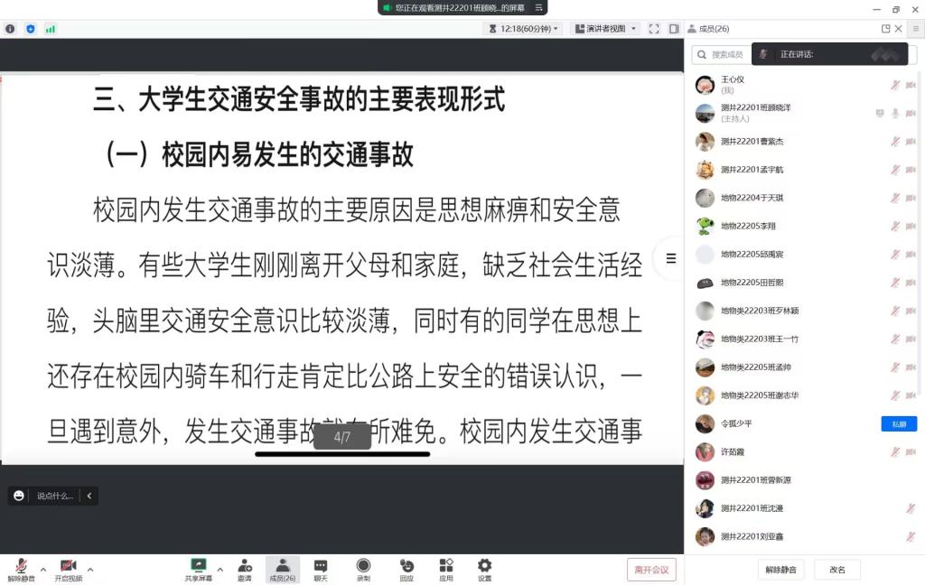 本次专题教育以线上形式开展,各班班长带领大家重温交通安全常识,普及交通规则、道路标识、行车安全等相关知识,引导学生树立正确的交通安全观念。通过观看交通安全教育微课程、阅读相关案例,同学们进一步认识到交通安全的重要性,做到假期安全出行。
