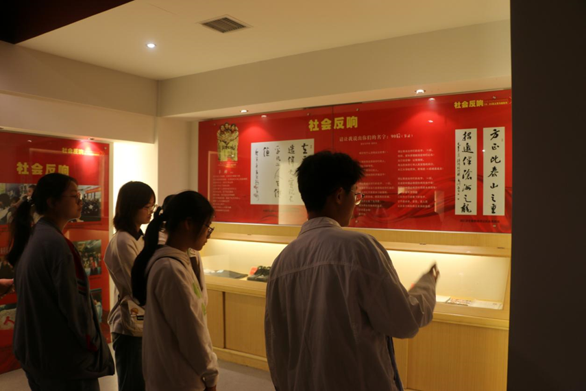 随后,同学们来到纪念馆二楼核心展区,这里记录着15年前的一场英雄壮举。2009年10月24日,15名长江大学学子在长江中组成“人链”,将两名不慎落水的少年成功救起,而陈及时、何东旭、方招三位英雄学子却不幸殒命于长江。
