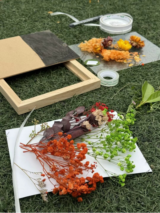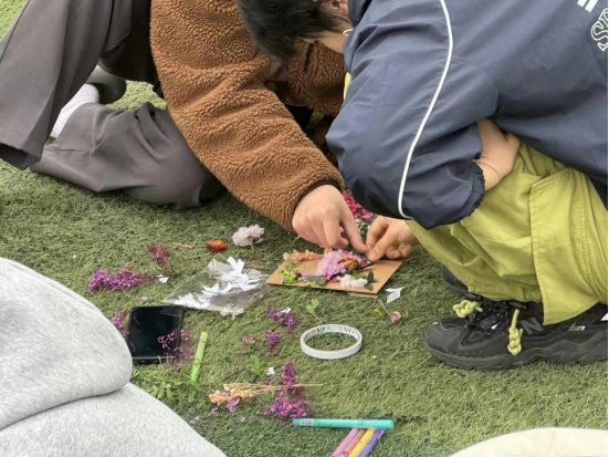 现场气氛活跃,同学们带着对美的期待投入创作。创作时,大家精心挑选植物标本,随后巧用双面胶、透明胶带固定标本,还以缎带进行装饰点缀。