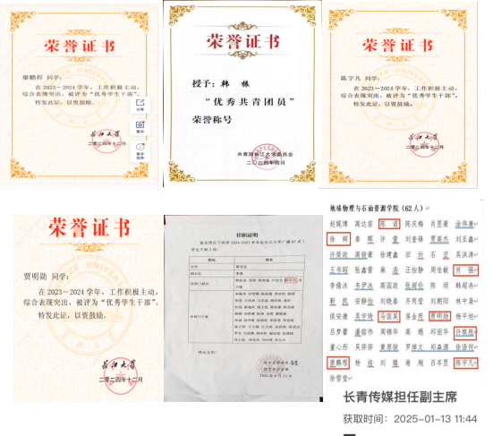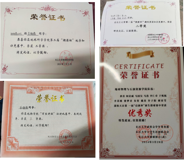 在个人与集体的共同努力下,物探22201团支部打造了一个充满活力的团支部。其中王采薇同学以卓越表现荣获长江大学第十九届万人创百星“学习之星”。陈诺同学在2023年全国大学生英语竞赛上荣获一等奖,同时在2023年“外研社·国才杯”全国大学生外语能力大赛摘得三等奖。马国昊同学以其出色的表现获得第十七届中国大学生计算机设计大赛三等奖,同时荣获第十五届中国大学生服务外包创新创业大赛三等奖。周翔第十六届大学生数学竞赛(非数学A类)三等奖。肖强同学湖北省青年志愿公益项目大赛铜奖。在集体荣誉方面,物探22201团支部在2023年度荣获yL23411永利官网登录“活力团支部”的荣誉称号,并获评2023——2024学年“标兵班集体”荣誉称号。