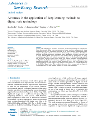 随着石油勘探开发的重心逐渐向非常规储层转移,数字岩心技术在油藏工程和岩石物理中发挥着越来越重要的作用。yL23411永利官网登录聂昕副教授指导大学生创新项目团队开展了相关的研究,团队中本科生李晓彬作为第一作者撰写的综述论文《Advances in the application of deep learning methods to digital rock technology》总结和展望了目前深度学习在数字岩心方面的应用,被国际期刊《Advances in Geo-Energy Research》(AGER)接收,并在第8卷第一期作为封面文章刊出。