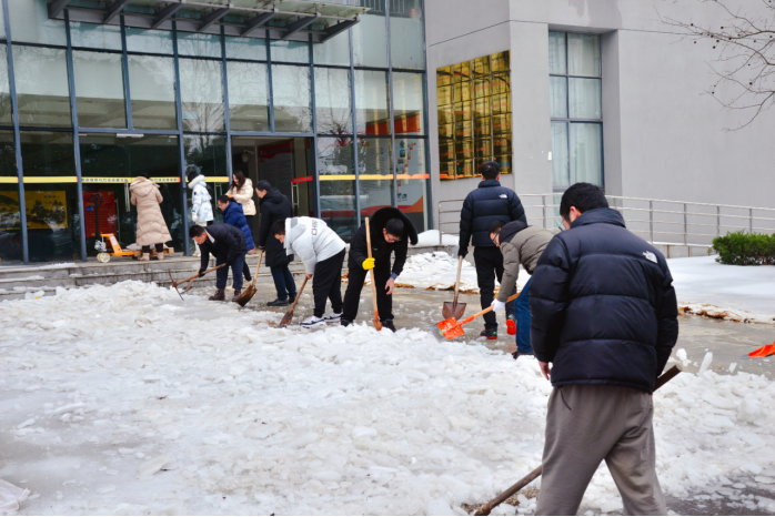 响应院党委号召,凝心聚力“除”冰雪。在一片白茫茫中,一群党员干部、专任教师不畏严寒、不惧风雪,纷纷拿起工具铲雪除冰,齐心协力对学院门前道路、学术报告广场等进行全面清扫,并在门前铺上了防滑麻袋,通过2个小时的努力,道路露出原本平坦的模样,师生的出行得到了极大的保障。据统计,有30余名教师参加了此次铲雪除冰行动,其中固体地球物理系周磊主任提供10余把铁锹,测井信息工程系教工党支部书记许巍捐赠3袋工业盐。